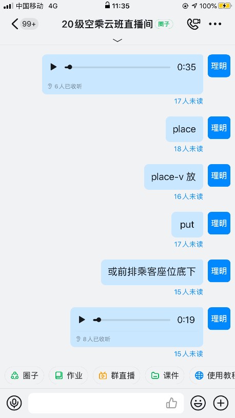 《客舱英文广播》是针对空乘专业二年级学生开设的一门重要的英语朗读类课程。马理明老师除了在线讲授日常授课部分,还通过钉钉帮学生录制词汇和广播词发音,要求学生进行课后练习并单独发送,做到及时点评。