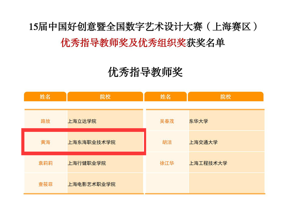 近日,第十五届“中国好创意”暨全国高校数字艺术设计大赛评选工作落下帷幕,艺术设计学院学子在本次比赛中再获佳绩,上海市空间设计组三等奖一名、优秀奖四名,黄海老师获优秀指导教师奖。
