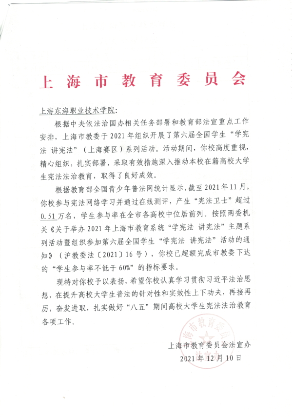 根据教育部全国青少年普法网统计,截止2021年11月,我校产生“宪法卫士”超过0.51万名,上海市教委对我校提升大学生普法工作的针对性和实效性给予了极大的鼓励和赞扬。