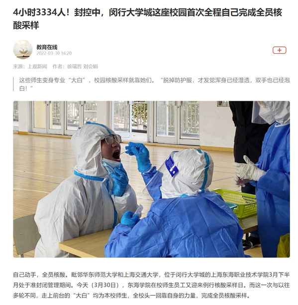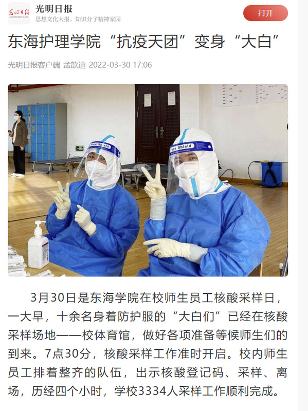 3月30日,上观新闻、光明日报分别以《4小时3334人!封控中,闵行大学城这座校园首次全程自己完成全员核酸采样》《东海护理学院“抗疫天团”变身“大白”》为题报道了我校全程自己完成核酸采样信息。