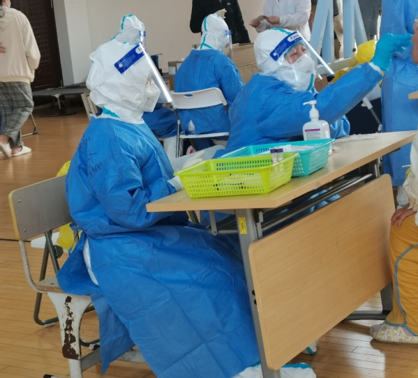 值得一提的是,此次核酸采样全程是由“东海人”自己来完成的。原来,在获悉属地核酸采样任务重、医护人员力量有限的消息后,校党委第一时间向护理学院发起号召,护理学院积极响应号召,邀请学院有护士执照和有临床护理经验的教师,组成一支由院长桑未心带队的“抗疫天团”,在校保健站的积极配合下,来承担校园准封闭管理时期全体师生员工的核酸采样任务。据悉,经区、镇疾控协调,桑未心院长于3月25日在闵行区卫健委,闵行区疾控和吴泾社区卫生服务中心的帮助指导下,又系统的学习了核酸采样、防护服穿脱等专业知识,并将学习视频发给“抗疫天团”成员提前学习,成员们认真学习自我防护知识技能,为30日核酸采样顺利进行做好做足准备。