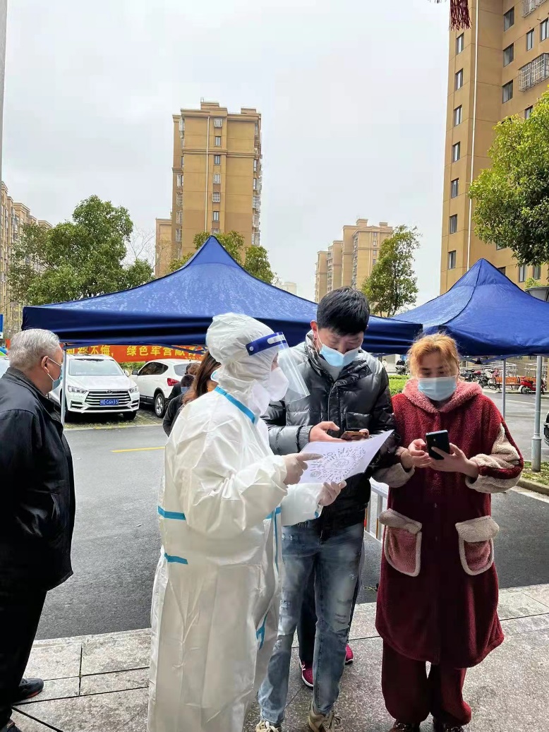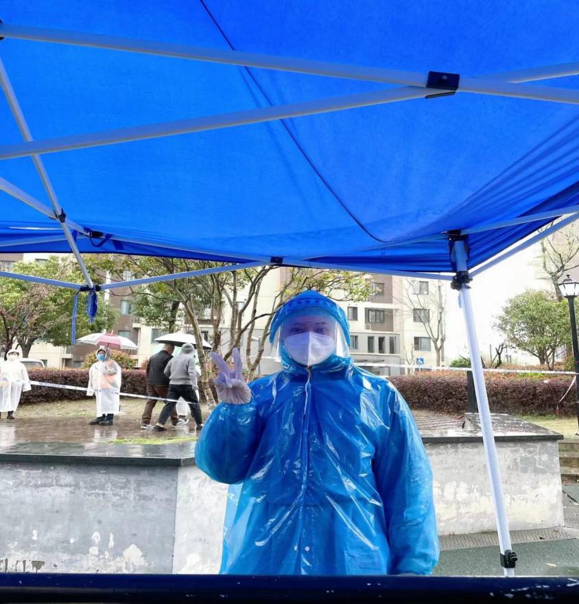 在社区工作人员的带领下,任禾全副武装,认真采集核酸检测信息,并耐心教会有需要的老人扫码流程。上海多变的天气,也从未阻断任禾积极抗疫的脚步,她用实际行动护小区平安。