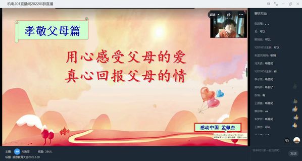 在孝敬父母篇,一首声情并茂的《母亲》歌曲感染了全场。两个孝敬父母的视频震撼了学生的心灵,那是感动中国人物孟佩杰从8岁开始十几年如一日照顾瘫痪的奍母,撑起一个家的感人故事和当看到二十年后自己父母年老的模样时那种心酸和不舍的画面。两位学生演讲了“疫情封控期间我和妈妈的故事”和“在疫情封控中留校学子致父母的一封信”。 他们情深意切,对父母倾诉了感激之情和思念之情。一位家长也连线发言,感谢学院多年来的感恩教育,培养了女儿的孝心和爱心。通过视频和学生的演讲,告诉学生们及时行孝的道理,“父母养育我们长大,我们陪伴父母变老”不是一句空话,希望学生们永远记住父母的养育之恩,以实际行动回报他们。