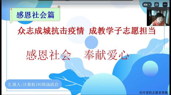 在感恩社会篇,播放了学院制作的短视频《向可爱的学生志愿者致敬》,展现了学院15位学生志愿者的风采。他们舍小爱为大爱,他们主动请缨,在各自的岗位上弘扬了“奉献、友爱、互助、进步”的志愿者精神,他们以饱满的热情、强烈的责任感投身到抗疫一线,用实际行动践行了“感恩社会、奉献爱心 的社会主义核心价值观。两位志愿者代表交流演讲了他们的体会和感想。《以感恩之心加入守护学校安全的抗疫志愿者队伍》讲述了学生主动留校帮助网络中心老师一起守护学校安全的感人故事。《感恩社会、传递爱心——我的一百天志愿者经历》讲述了学生参与医院疫情防控工作,坚守岗位一百天的感人故事,一百天志愿服务经历,支撑她坚持不懈的动力,不仅是她的爱心,还有父母的支持和鼓励。大会请到了学生的妈妈连线感言,“能尽自己微薄的力量为社会做一点贡献是很幸运的一件事”,这是妈妈教育孩子的话。全场被母女爱心的传递所感动。