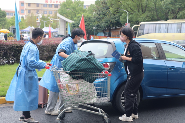 在校园重要路口,身着“小蓝”的学校护校队队员和学生志愿者穿梭忙碌,热情迎接新生。他们帮新生们把行李放到推车中,并送至体育馆办理住宿、入学手续,爱心奉献,辛勤忙碌,为青春奏响动人的音符。