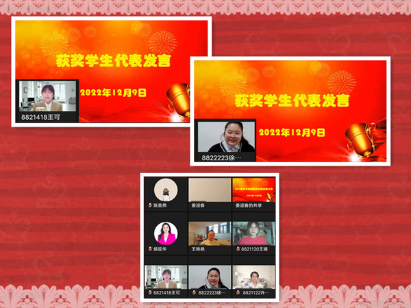 艺术教研室主任侯延华代表学院发言。她表示,技能比赛是职业教育不可分割的重要部分,要让技能比赛成为展示职业教育成果的平台,通过技能比赛,推进职业教育教学改革,提升我们的教学水平和人才培养质量。教师王艳艳宣读获奖名单,获奖学生开启摄像头截图留念。获奖学生代表学前222徐雨轩、学前211王可发言,她们表示:比赛让同学们展示技艺,开阔视野,提高了专业水平,同时也要审视自身的差距,更加努力学习和掌握技能,不辜负老师们的期望。