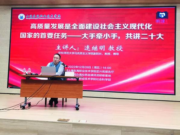 为深入学习贯彻习近平新时代中国特色社会主义思想和党的二十大精神,全面落实高校思想政治队伍建设有关文件要求,在校党委的大力支持下,12月9日,由上海民办高校思政课师资研修基地(上海杉达学院)主办,我校社科部公民共建项目承办的明理讲坛在我校开讲了,此次特邀了华东师范大学马克思主义学院副院长,博士生导师速继明教授,开展了《高质量发展是全面建设社会主义现代化国家的首要任务——大手牵小手,共讲二十大》的讲座,我校社科部的全体教师、各部门学院党支部书记和全体辅导员参会。相关兄弟院校的教师通过网络直播的形式进行线上学习。