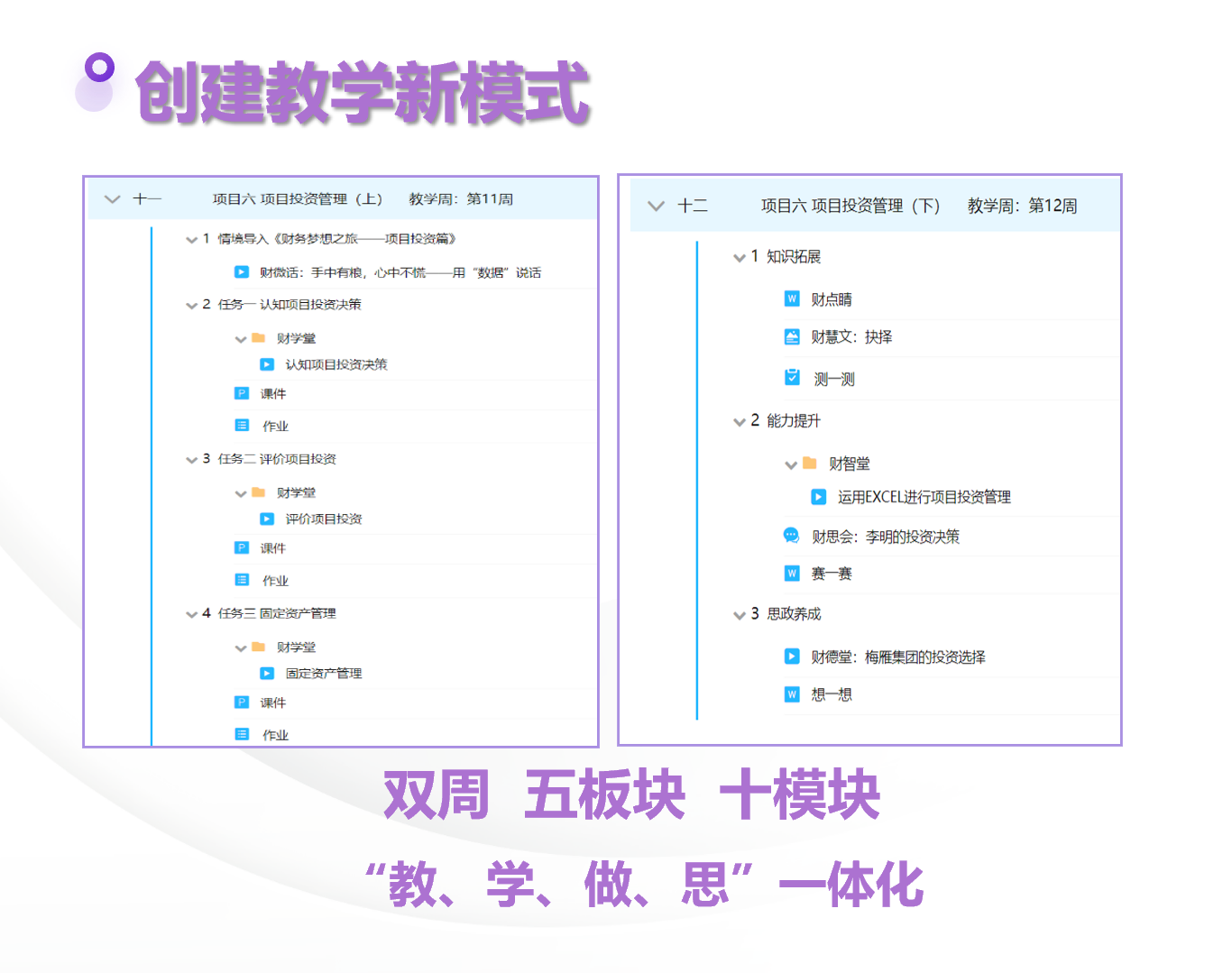 每个项目学习周期为两周:第一周开展“情境导入”和“教学任务”两大板块,进行基础知识与方法的学习;第二周开展“知识拓展”“能力提升”“思政养成”三大板块,实现专业知识、岗位技能与职业素养的同步提升。