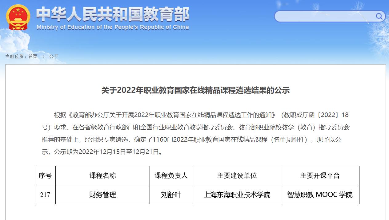 近日,教育部职业教育与成人教育司公示了2022年职业教育国家在线精品课程遴选结果,我校经管学院副教授刘舒叶主持的《财务管理》课程入选。