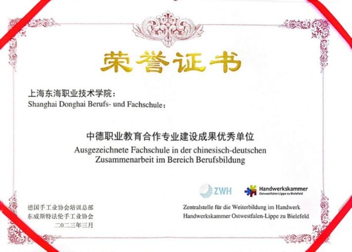 东海学院机电学院自2014年起,先后与德国手工业协会、德国工商大会建立了合作关系,开展汽车和机电类专业双证培养(东海学历证书+德国技能证书),在教学标准、教学模式、基地建设、课程建设、考核评价等方面,实现与德国职业资格认证标准的融通,提高了人才培养质量和供需匹配度,在推动国际化职业教育合作,培养具有国际化视野的高素质技术技能人才,服务长三角职业教育协同发展等方面作出了积极的贡献。