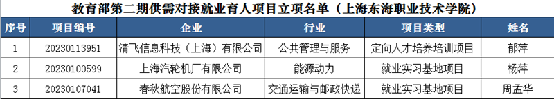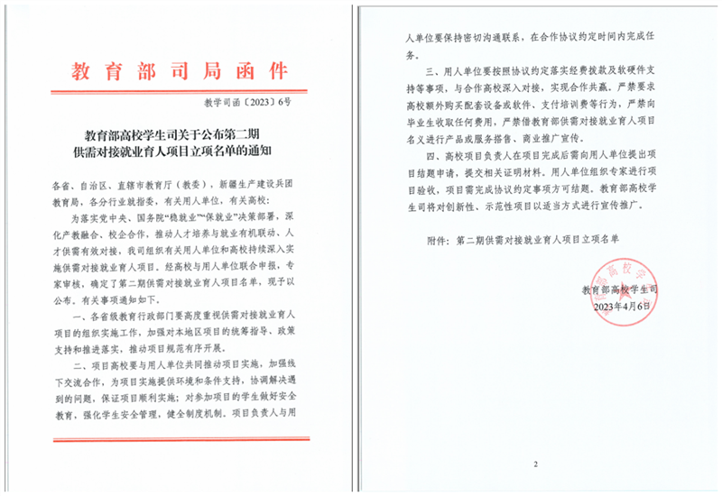 近日,教育部高校学生司发布《教育部高校学生司关于公布第二期供需对接就业育人项目立项名单的通知》(教学司函〔2023〕6号),经校企对接、用人单位申报、专家审核、立项单位信息核查等流程,我校共有3个项目通过审批、获准立项,其中就业实习基地项目2项、定向人才培养培训项目1项,实现了新的突破。