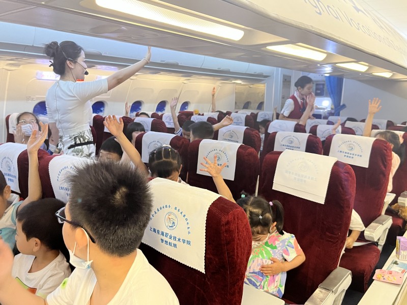 在乘务服务体验环节,拥有丰富飞行经历的乘务专业教师通过现场演示的方式向大家介绍机场服务的基本流程,深入浅出地讲解了安全带、救生衣等主要客舱安全设备的正确使用方法,向孩子们展示了迎客、安全演示、餐食服务以及送客等整个客舱服务流程。在互动环节,孩子们积极参与,扮演小乘务员角色体验了迎客、分发餐饮以及穿戴救生衣。孩子们积极参与航空安全知识的快问快答,现场气氛热烈欢快。