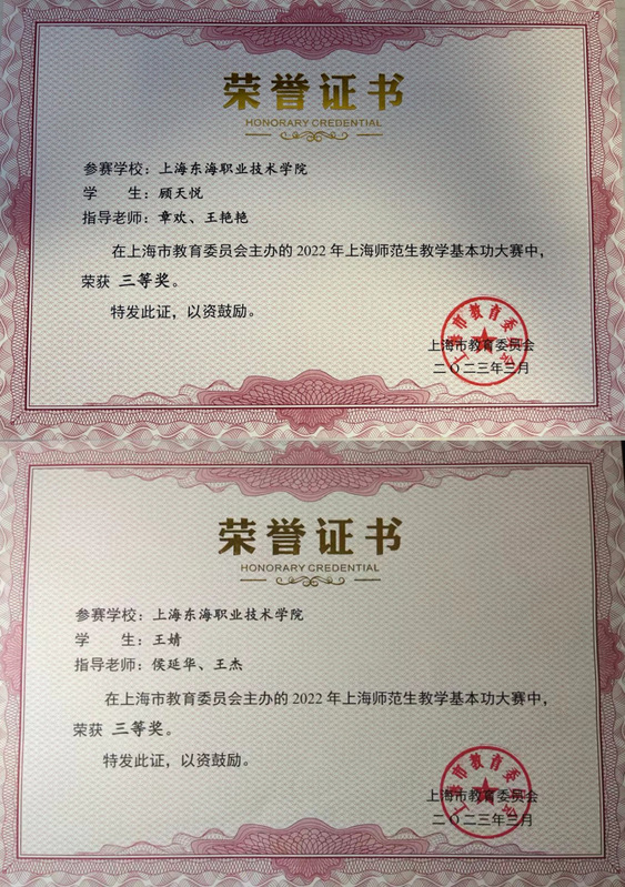 2023年3月10日,市教委发文公布了第四届上海师范生教学基本功大赛获奖名单,我校教育学院2021级学生顾天悦、王婧获得学前教育组三等奖。教育学院自首次参加上海师范生教学基本功大赛以来,已获得一、二、三奖,获奖10人次以上。