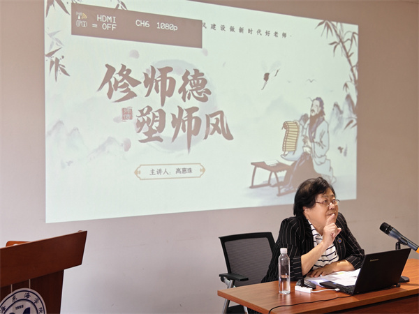 高惠珠教授以“修师德 塑师风”为主题,重点解读了《高等学校教师职业道德规范》和《新时代高校教师职业行为十项准则》,并以常见的师德师风问题负面典型案例对教职工进行师德师风警示教育。随后,她进一步阐述了师德师风的内涵、两者关系以及加强高校师德师风建设的重要意义。她认为加强高校师德师风建设不仅是中国特色社会主义建设的必然要求、是高校发展建设的内在动力,更是提高高校教师队伍质量的关键因素。