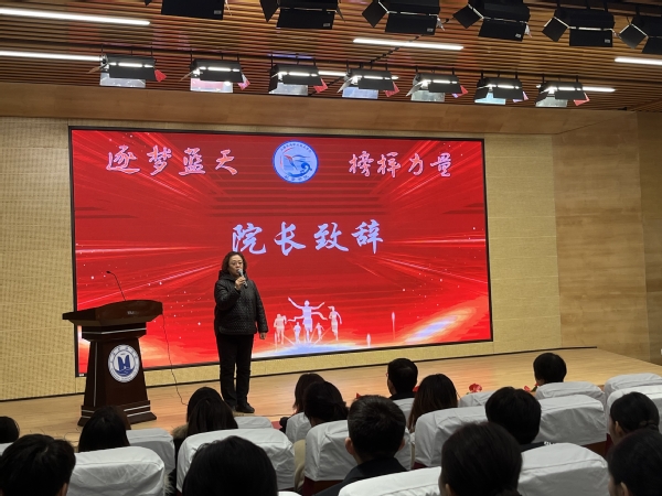 周孟华在典礼上致辞,向受到表彰的优秀学生表示热烈祝贺,并鼓励航院学子向身边的朋辈榜样看齐,自觉将中国民航精神融入到学习和实践中,融入到个人发展中,用忠诚担当的优秀品格、严谨科学的专业精神、团结协作的工作作风继续书写航院青年的奋进之笔,以新气象、新担当、新作为开启新的一年。她向航院学子提出三点希望:一是以敢于直面一切挑战的勇毅,以愚公移山、精卫填海的坚韧,在人生的道路上百折不挠、一往无前。二是要始终保有对专业学习的热情,对生活的热爱,在大学中脚踏实地、健康成长。三是要正确认识自己,努力完善自己,实现德智体美劳全面发展,做有益于他人、有益于国家的时代新人。