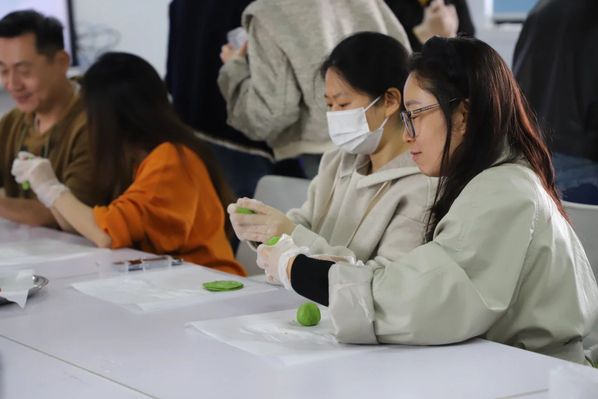 熟知了青团的制作方法后,大家便专心致志地制作起自己的青团。搓、压、揉、团,各种动作齐上阵。不一会儿,根据个人喜好制作的形态各异的青青团子就做好了。