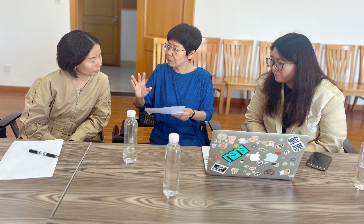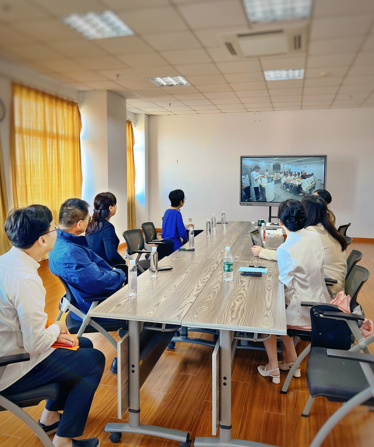 随后,校领导们来到了东海源北707基础部会议室,该会议室已经是我校参加2024年上海市职业院校技能大赛教学能力比赛的联合集训室,我校两支参赛队伍,教育学院《儿童实用美术》课程团队和基础部《职场英语》课程团队正在进行联合备赛,校领导们集体观看了参赛教学视频节选,贺瑛对参赛教学视频的内容和拍摄质量特别关注,还就发现的问题和牛晓伟、谭聪聪两位队长进行了一对一的交流和指导。