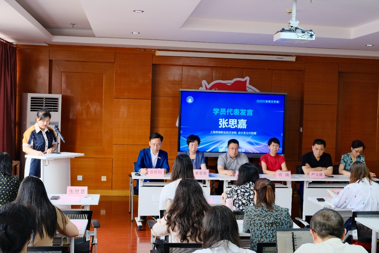 刘舒叶作为工作室主持人发言。她用“感谢”“责任”和“行动”三个词展开发言,介绍了建设目标、举措和预期成效,表示将带领学员共同进步,并将建设经验和建设成果向各兄弟院校推广和共享,充分发挥名师工作室的示范和辐射作用,推动上海高职《大数据与会计》专业的转型升级,共同提升人才培养质量。