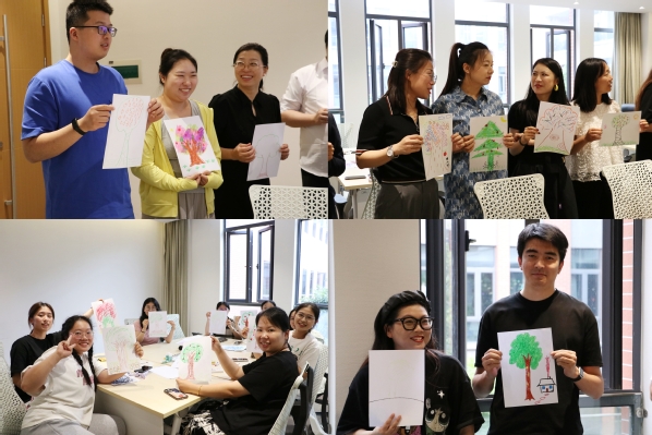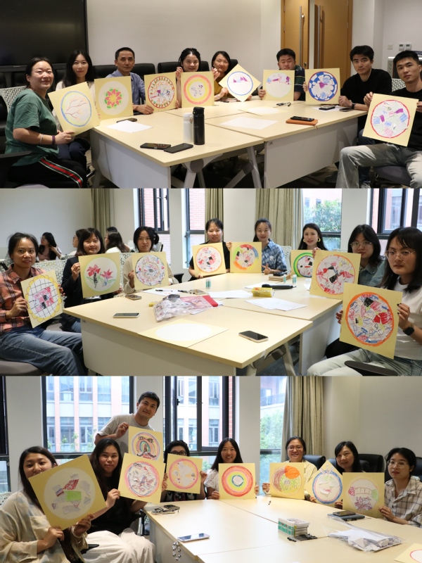 毕玉芳教授基于中国传统文化,结合十几年的心理实践,创立了写意曼陀罗艺术疗法,通过绘制和观赏曼陀罗图案辅助意识与潜意识连结,帮助参与者重新实现整合,缓解焦虑,放松身体,静心减压。毕玉芳通过放松游戏帮助学工团队老师减压,拉近彼此间关系。她引导每位老师创作一幅主题为“树”的绘画,并鼓励自由的艺术表达。绘画完成后,让参与者们观察他人的绘画并分享自己的创作经历,以此来促进在场师生之间的破冰、自我表达和相互支持。通过小组讨论,让老师制定规则,增强小组成员的归属感和安全感。随后,毕玉芳详细介绍了个人如何画写意曼罗兰以及写意曼陀罗的具体应用。她指出在日常学习生活中,在感到压抑的时候,可以通过此方式抒写自己的心意,抒发内心的真实情感,从而达到管理情绪、调节身心关系、舒缓压力的目的。