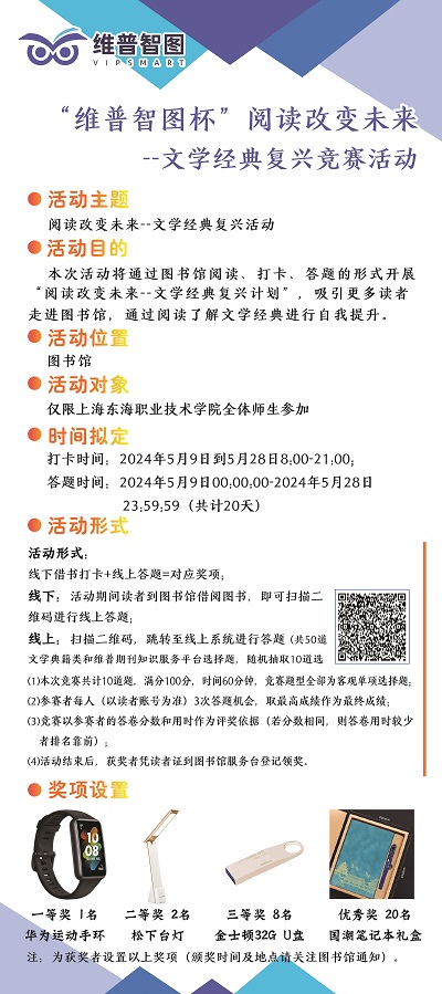 6.开展阅读竞赛活动。5月9日至5月28日,图书馆联系重庆维普(电子资源供应商)开展“维普智图杯”阅读改变未来——文学经典复兴竞赛活动,通过读者到馆阅读、打卡、线上答题的形式,吸引众多读者走进图书馆,通过阅读了解文学经典、达到自我提升。此次活动设置有华为运动手环、松下台灯、金士顿32G U盘等丰厚奖品,最终高明(经管学院)、罗海燕(经管学院)、沈珈琦(护理学院)等30名读者获奖。