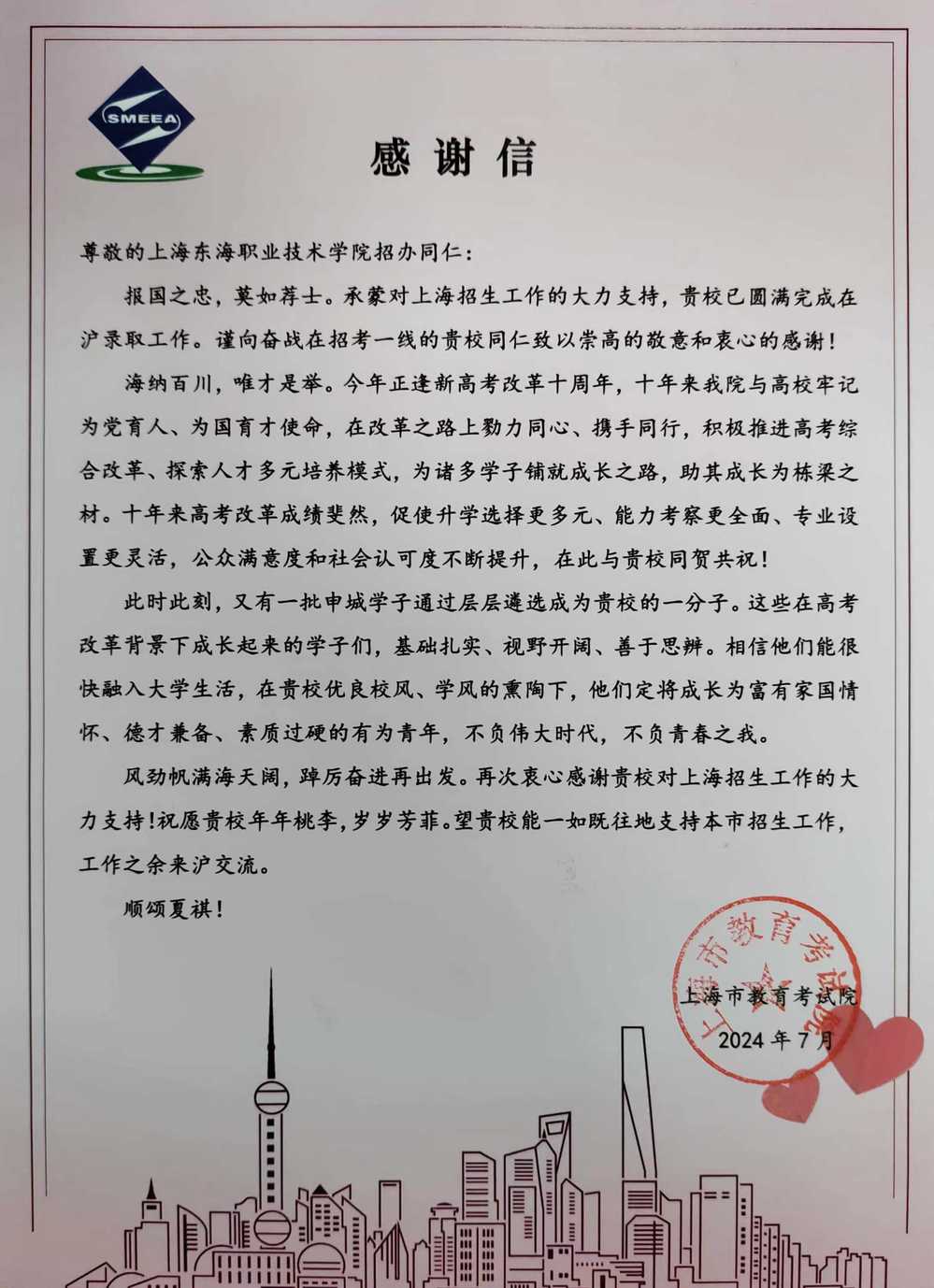 近日,上海市教育考试院向我校发来感谢信,祝贺我校圆满完成本市招生录取工作,并衷心感谢学校对本市招生工作的大力支持。
