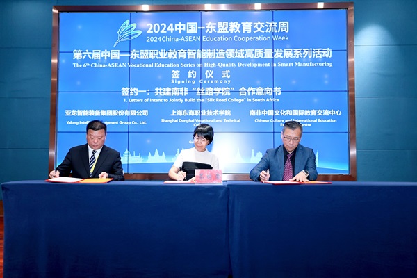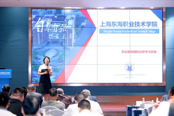 活动期间,贺瑛与上级领导和相关企业、高校负责人交流互动,了解感受国家和兄弟高校的职业教育及国际化政策导向、发展趋势,宣传介绍东海学院的办学定位与发展成就。在大会签约仪式环节,上海东海职业技术学院与亚龙智能装备集团和南非中国文化和国际教育交流中心签署了共建南非“丝路学院”合作意向书。签约仪式后,各高校、企业领导专家围绕“职业教育智能制造领域人才培养”“职业教育国际合作”两个方面开展主题报告。贺瑛以“上海东海职业技术学院职业教育国际化思考与实践”为题,阐述了在经济全球化背景下职业教育国际化发展的必要性和东海实践的成功案例,希望与更多高职院校和企业共同推进产教融合,构建更加紧密的合作关系。