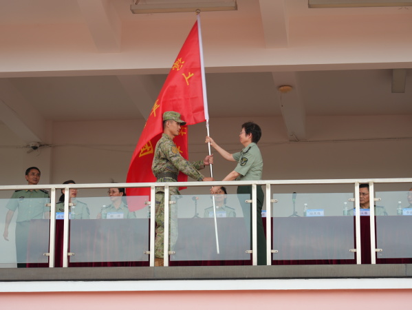 党委书记曹蓉蓉向军训团团长授予“上海东海职业技术学院军训团团旗”,我校2024年学生军训正式拉开帷幕,火红的军训团旗再次在东海的校园里飘扬。