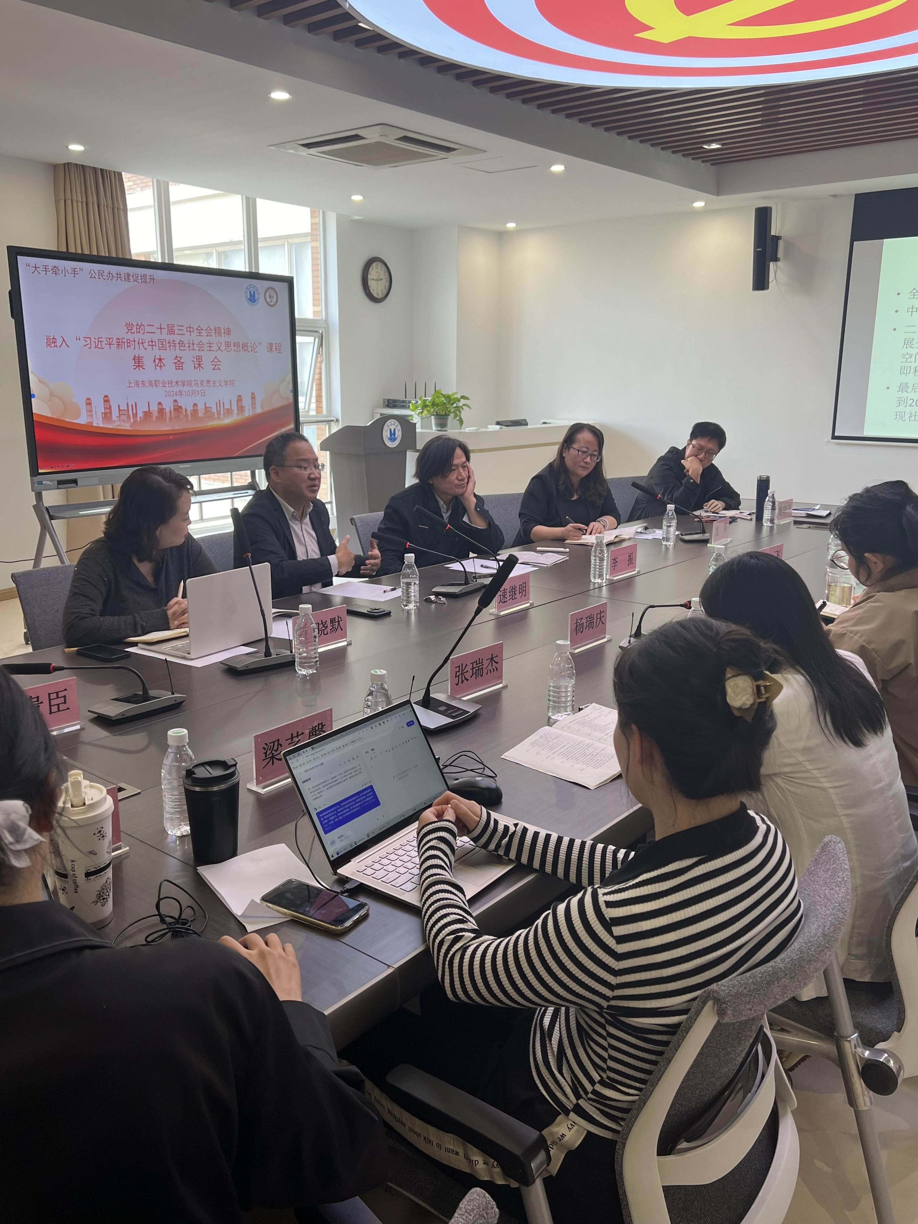 10月9日下午,上海东海职业技术学院马克思主义学院举办了一场关于如何将党的二十届三中全会精神融入《习近平新时代中国特色社会主义思想概论》课程的集体备课会。此次会议特别邀请了同济大学马克思主义学院的李振教授和华东师范大学马克思主义学院的速继明教授作为主讲嘉宾。
