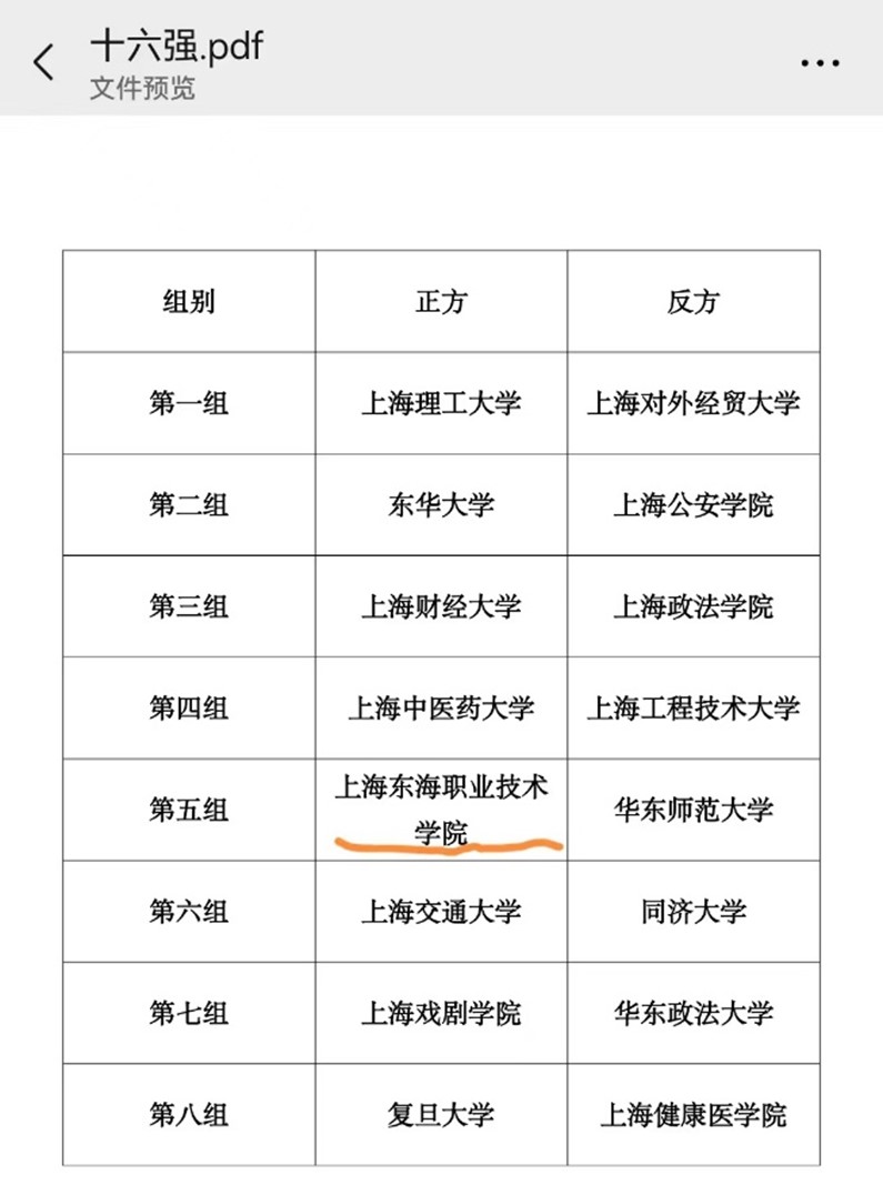 在预赛中,我校辩论队以才思敏捷的、逻辑严谨的思辨能力、配合紧密的团队精神,接连战胜了上海电机学院、上海海事大学两所沪上知名本科院校,成功进入全市十六强,成为唯一一支进入十六强的高职院校辩论队,也是唯一一支晋级的民办高校辩论队。