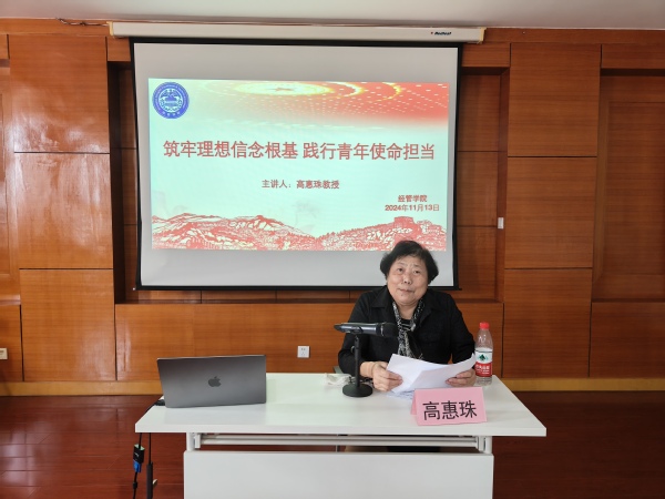高惠珠教授在讲座中深入解读了习近平总书记对于青年干部的殷切期望:“年轻干部是党和国家事业发展的希望,必须筑牢理想信念根基,守住拒腐防变防线,树立和践行正确政绩观,练就过硬本领,发扬担当和斗争精神,贯彻党的群众路线,锤炼对党忠诚的政治品格,树立不负人民的家国情怀,追求高尚纯粹的思想境界,为党和人民事业拼搏奉献,在新时代新征程上留下无悔的奋斗足迹。”高惠珠强调,当代青年学子应深刻领会习近平总书记重要指示精神,将个人成长与国家发展紧密相连,在新时代浪潮中找准方向,砥砺前行。她还结合中央文件《关于深化新时代学校思想政治理论课改革创新的若干意见》深入剖析了新时代背景下思政教育的重要性和紧迫性。分析了新时代背景下思政教育的重要性与新要求,尤其是要聚焦经管类学生的特点,有针对性地开展思政教育,助力青年学子树立正确的三观,提升思想道德修养与综合素养,为未来职业发展与社会贡献奠定坚实基础。