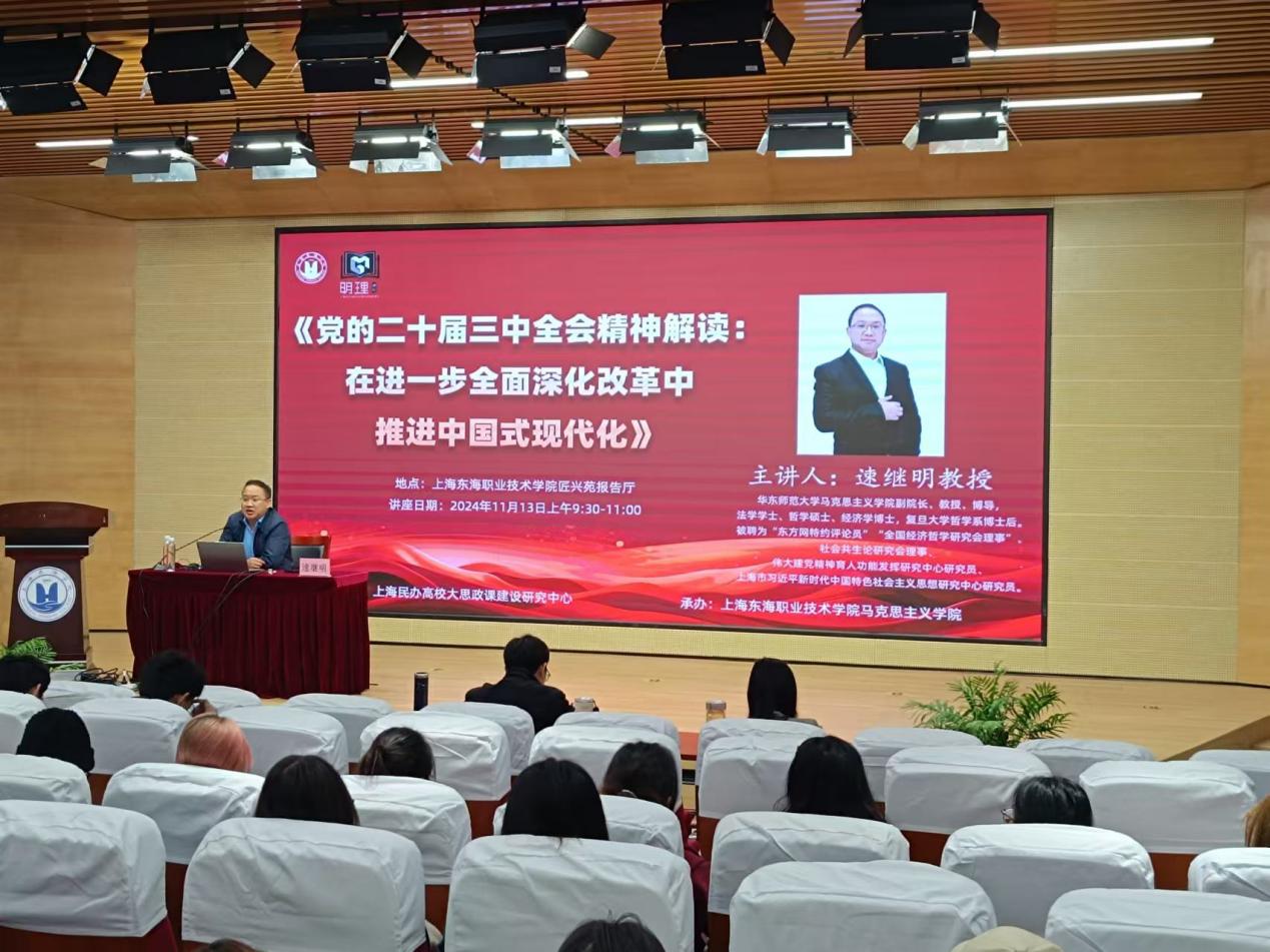 为深入学习贯彻党的二十届三中全会精神,2024年11月13日上午,由上海民办高校思政课师资研修基地主办、上海东海职业技术学院马克思主义学院承办的“明理讲坛”于匠兴苑学术报告厅如期举行。本次“明理讲坛”邀请到华东师范大学马克思主义学院副院长速继明教授,为我校师生带来了一场主题为《党的二十届三中全会精神解读:在进一步全面深化改革中推进中国式现代化》的专题讲座。现场共有160余位师生聆听了讲座。