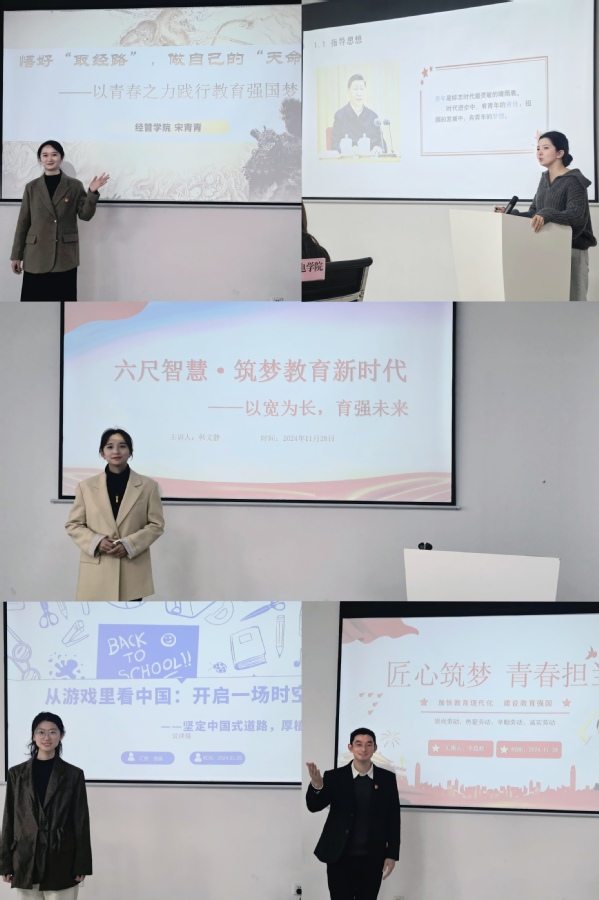决赛现场,各位辅导员呈现了精彩纷呈的主题班会。经管学院许一琳老师以《激发内驱,探寻人生passion》为主题,引导学生认识内驱力的重要性,并探索大学生活目标;艺术设计学院李海迪老师则以《择业积“贝”,“兼”程逐梦》为题,帮助学生认清就业形势,激发就业热情;传媒学院白婷老师通过《国货正当潮》的主题,增强学生文化自信,弘扬民族文化;教育学院焦庆超老师以《玩好人生这场游戏》为题,探讨游戏与文化传播的关系,引领学生明确成长目标;机电学院倪晨老师则以《从游戏里看中国:开启一场时空旅程》为主题,引导学生正确理解中国式现代化道路,厚植爱国主义情怀;经管学院宋青青老师以《悟好“取经路”,做自己的“天命人”—以青年之力践行教育强国梦》为主题,围绕“识路、探路、行路”三条情境线,引导学生领悟个人成长与“取经路”的契合,成为担当奋斗者。航空学院曲古鲁克老师以《指尖上的微能量》鼓励学生汇聚正能量,共同书写网络文明新篇章;信息工程学院韩文静老师通过《六尺智慧·筑梦教育新时代——以宽为长,育强未来》的主题,运用中国传统文化思想解决社区人际关系问题;机电学院于昌辉老师则以《匠心筑梦 青春当担—加快教育现代化 建设教育强国》为题,鼓励学生积极参与实践,为未来投身机电行业、助力教育强国建设奠定坚实基础。