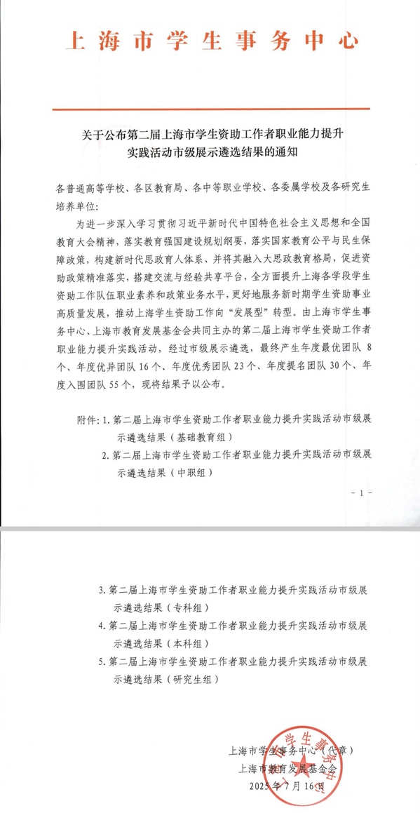 此次比赛是上海市学生事务中心、上海市教育发展基金会联合主办的第二届上海市学生资助工作者职业能力提升实践活动。赛制为团队赛,分市级初赛和决赛,历时近1个月,全市133支队伍参加初赛,最终77支队伍进入决赛。校党委副书记王玉高度重视,学生处处长岳宝华全程参与指导比赛,经过激烈的角逐,资助工作者团队不负众望,斩获最高荣誉。