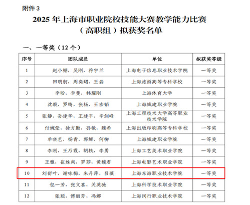 此次获奖彰显了东海学院在职业教育改革与创新中的突出成效,展现了学校对接数字经济时代需求、培养高素质技术技能人才的鲜明特色。接下来,学校将继续深化“以赛促教、以赛促学”机制,推动教学理念与产业实践的深度融合,进一步提升教师教学能力和人才培养质量,为服务上海市职业教育高质量发展和国家战略需求贡献更多力量。(通讯员 曹嘉珉)