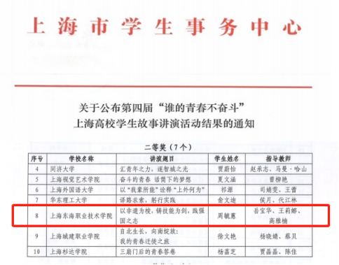 喜报 我校学子在第四届“谁的青春不奋斗”上海高校学生故事讲演活动中荣获佳绩