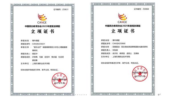 在2025年度中国民办教育协会规划课题(青年课题)立项名单中,我校教育学院侯延华老师的课题《“音乐治疗”赋能高职院校大学生心理健康教育研究》和国际交流处刘怡辰老师的课题《双维驱动:民办高校英语课程国际化路径研究》双双荣列。