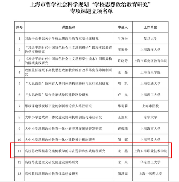近期,我校多位老师获得科研课题立项。在上海市哲学社会科学规划办公室公布的上海市哲学社会科学规划“学校思想政治教育研究”专项课题立项名单中,我校马克思主义学院龙燕老师的课题《高校思政课精准化案例教学的内在逻辑和实践路径研究》获得立项,我校是上海市哲学社会科学办公室公布的30所立项单位中唯一的民办职业高校。