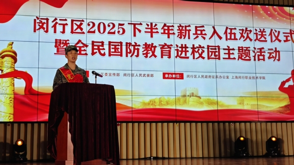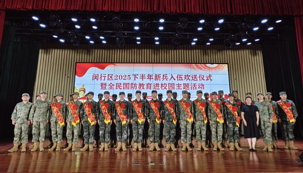 9月15日下午,闵行区2025 年下半年新兵入伍欢送仪式在闵行职业技术学院举行,我校30名应征入伍学子身着崭新迷彩服,与全区其他高校、街道(镇)的新兵代表共同踏上军旅征程。校党委副书记王玉、武装部部长岳宝华及武装部相关人员参加仪式,为我校新兵送上母校的嘱托与祝福。