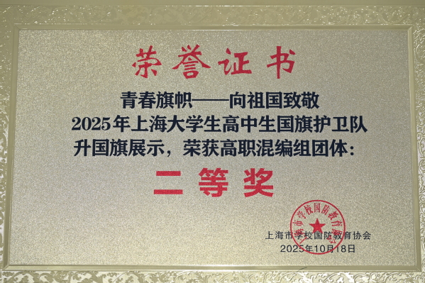 10月18日,在“青春旗帜,向祖国致敬”上海市大学生国旗护卫队升国旗展示竞赛中,我校国旗护卫队凭借出色的表现荣获高职混编组团体二等奖。此次竞赛活动由上海市学校国防教育协会、上海市国防教育中心主办,共有22所上海高校参加。