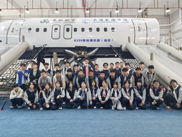 在航空学院专业教师及学生的引导下,贯通班学生参观了东海学院校园,并到航空实训中心开展研学。亲身体验动态模拟舱实训室,是本次参访的一大亮点。在动态模拟实训室,专业教师引导学生学习客舱安全与应急处置知识,通过这种“零距离”的接触,拉近学生对民航客运工作场景的距离,增进对民航客运工作的理解,培养学生敬畏生命、敬畏规章、敬畏职责的民航精神。