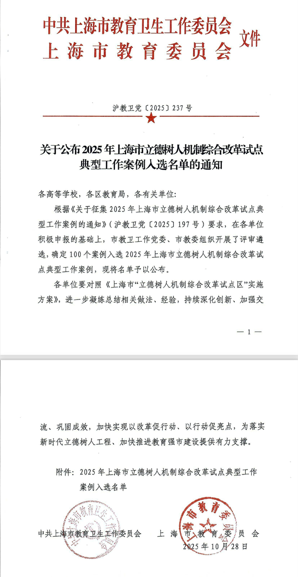 日前,上海市教卫工作党委、市教委公布《2025年上海市立德树人机制综合改革试点典型工作案例》入选名单,我校《打造“三维联动”育人路径,有形有感有效铸牢中华民族共同体意识》案例成功入选。