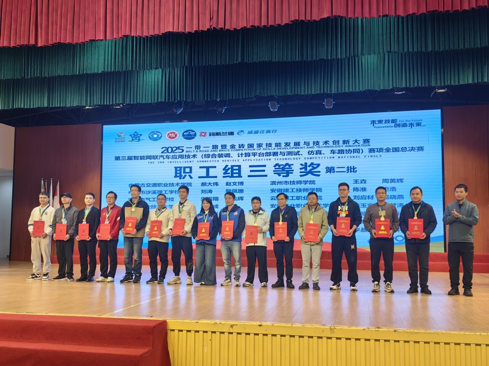 2025一带一路暨金砖国家技能发展与技术创新大赛第三届智能网联汽车应用技术赛项全国总决赛于2025年11月6日至9日在安徽汽车职业技术学院圆满落幕。上海东海职业技术学院机电学院师生组成的参赛队伍凭借扎实的专业功底、默契的团队协作和出色的临场发挥,奋勇拼搏,最终斩获高校学生组二等奖1项、三等奖1项,高校职工组三等奖1项的优异成绩,为学校赢得了荣誉。