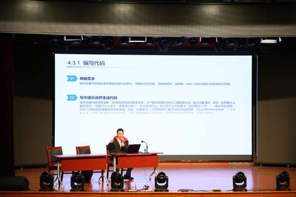 讲座内容从理论到实践,为师生们提供了应用指南。李忠唐副教授系统阐释了人工智能的核心概念,重点剖析了当前热门的AIGC(生成式人工智能)的底层逻辑,指出生成式模型与扩散式模型是其核心技术双引擎。讲座现场,他通过AI自动化编程实例,展示了如何运用提示词工程高效生成Python代码框架。AIGC技术的功能类别及典型应用场景丰富多样。例如,在文本创作方面可用于广告文案、新闻写作,能有效提升内容生成效率;图像创作可进行风格迁移、老照片修复,降低了设计技术门槛;数据分析能进行Excel处理、可视化图表生成,简化了数据解读流程。电商商品图制作、智能客服对话等都是AIGC技术的典型应用案例。