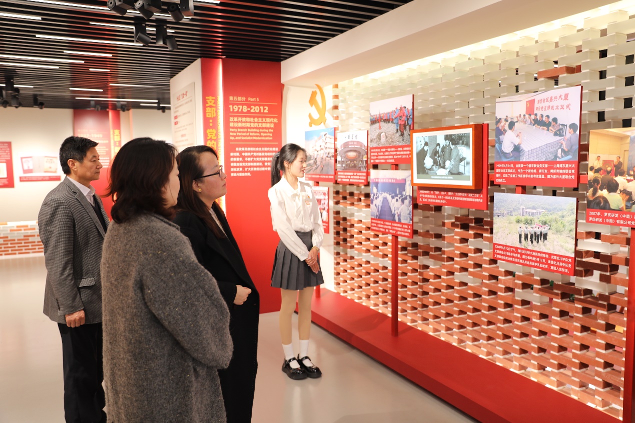 在纪念馆序厅,面对鲜艳的党旗,党支部书记龙燕带领支部委员重温入党誓词,进一步坚定理想信念。在纪念馆国旗展厅,来自东海学院的青年大学生志愿者陈建名、刘桐妤两位同学详细讲解了中国共产党党支部建设的发展历程。通过一幅幅珍贵的历史图片、文物资料,深入了解我党加强基层组织建设的光辉历程,深刻感悟了老一辈共产党人加强党的支部建设的探索精神。