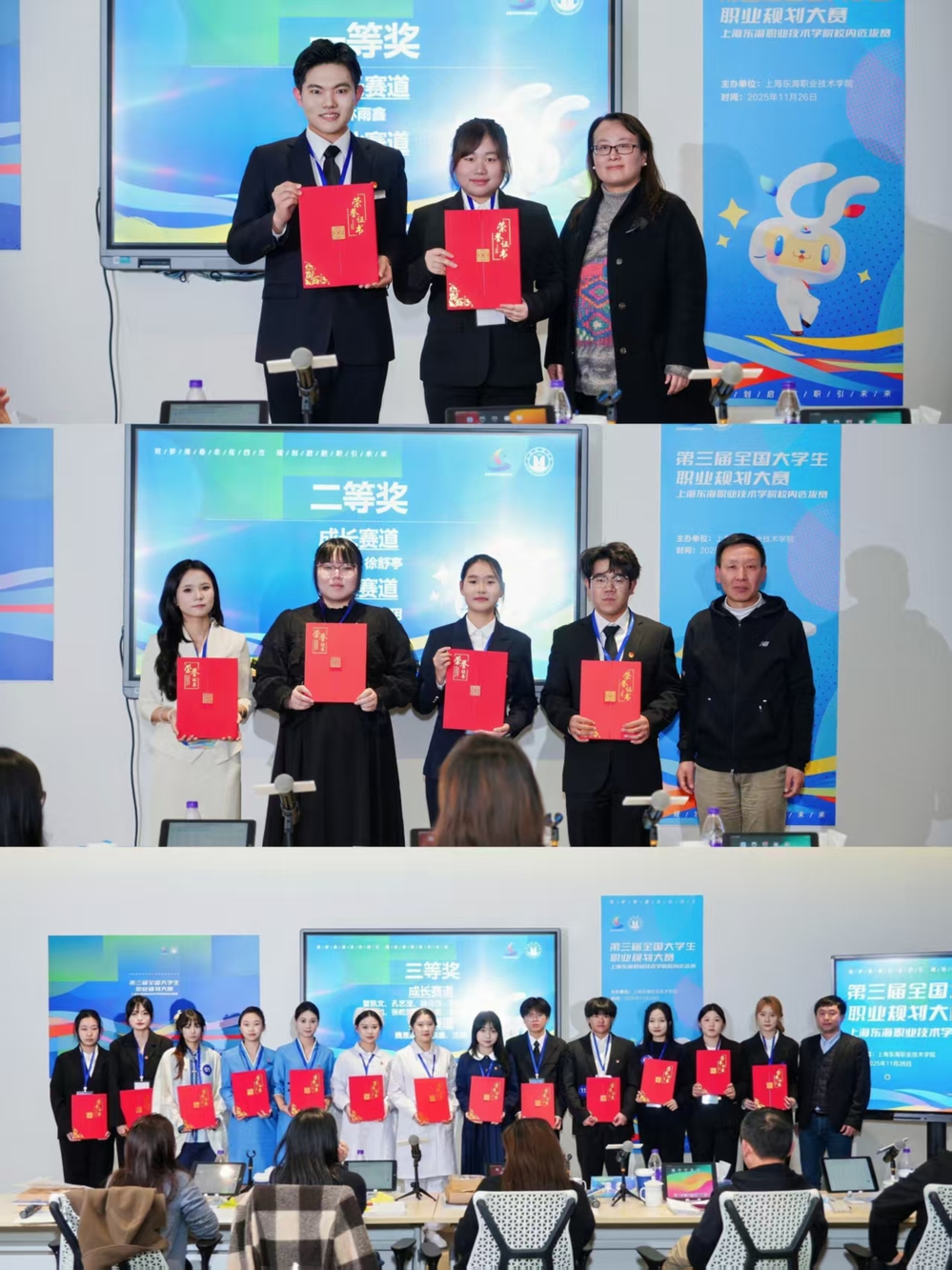 经过激烈角逐,就业赛道中,航空学院杜雨禄获一等奖,经管学院吴欣玥、传媒学院姚懿祯获二等奖,经管学院齐悦鑫、机电学院魏昱嘉、机电学院沈榕获三等奖;成长赛道中,艺术设计学院林宇鑫获一等奖,信息工程学院孟伟鹏、艺术设计学院徐舒亭获二等奖,经管学院管凯文、孔艺澄,艺术设计学院顾佳佳,护理学院吴冰洁、尚轩如,信息工程学院张屹炀,航空学院范丹君、焦妍超,经管学院周思逸获三等奖。