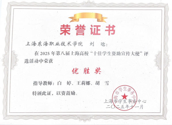 近日,在上海市教育委员会指导、上海市学生事务中心主办下,第八届“我为资助代言”上海高校十佳学生资助宣传大使评选活动于同济大学顺利收官。我校影视动画专业2023级学生刘唸荣获“优胜奖”。
