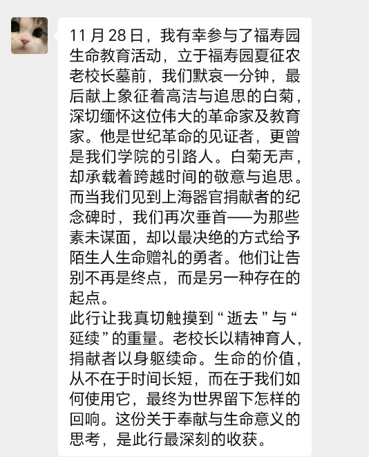 为深化生命教育的实践内涵,创新心理健康教育形式,11月30日,马院依托《大学生心理健康教育》课程,组织25级心理委员走进福寿园开展生命教育活动,通过实地探访方式,带领心理委员们瞻仰先贤们的生命故事。