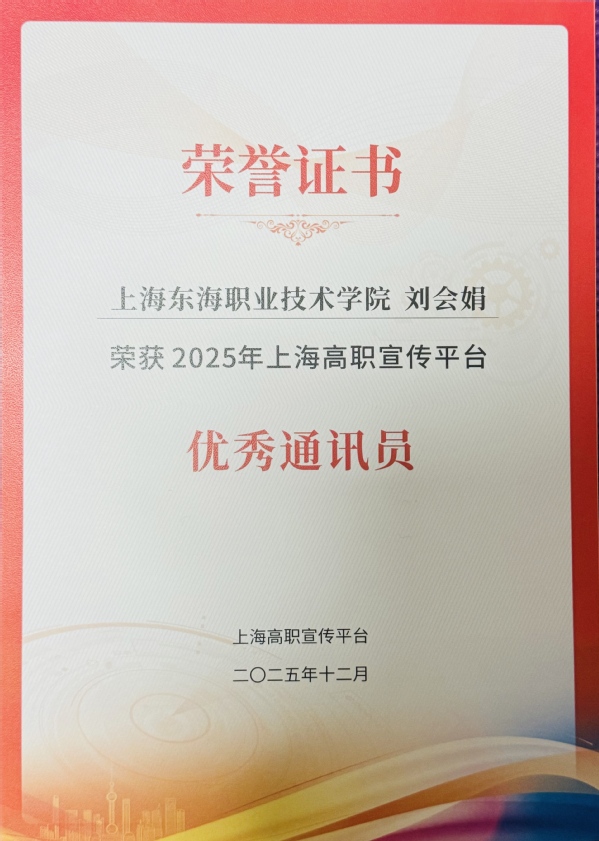 在12月5日举行的上海高职宣传平台2025年通讯联络培训会上,我校宣传工作再获佳绩:上海东海职业技术学院被授予“2025年上海高职宣传平台优秀通讯单位”称号,党委宣传部刘会娟老师荣获“2025年上海高职宣传平台优秀通讯员”荣誉称号。此次获奖,是对我校长期以来高度重视宣传思想工作、持续提升内容质量、积极对接高职宣传平台的充分肯定。