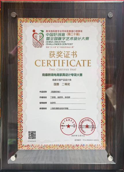 在日前举行的第20届中国好创意暨全国数字艺术设计大赛南康家具专项赛中,我校艺术设计学院环境艺术设计专业学子丁彦君、徐舒亭、朱钰婷团队的家具文创设计作品《南康印象——小榫居》,在全国众多参赛作品中脱颖而出,斩获二等奖,展现出扎实的专业功底。