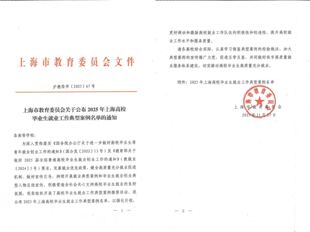 喜讯!我校两项案例获评2025年上海高校毕业生就业工作典型案例